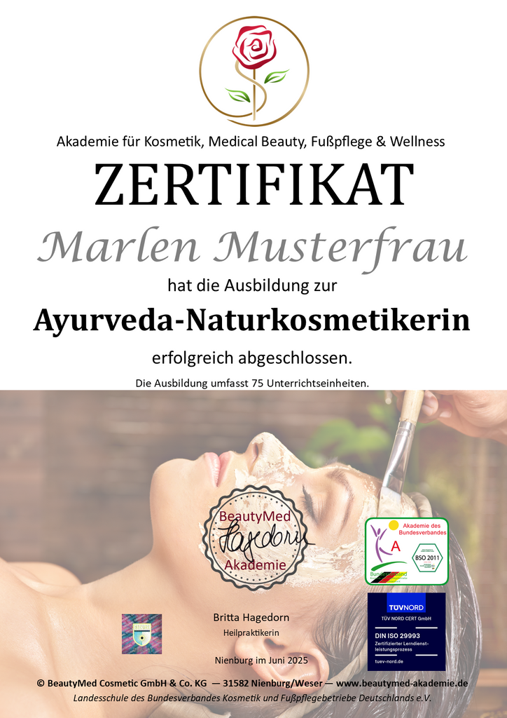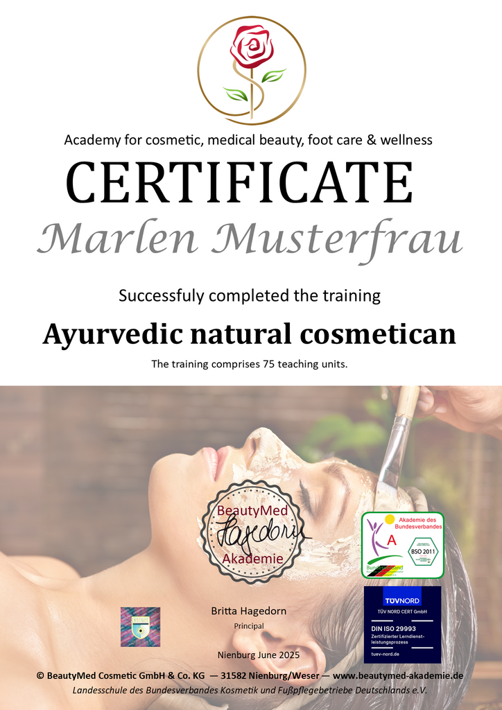 Abschluss: Nach der Ausbildung erhältst Du das Zertifikat "Ayurveda-Naturkosmetikerin". Die Zertifikate erhältst Du von uns automatisch zugeschickt, wenn Du die Online Ausbildung komplett durchgearbeitet hast.