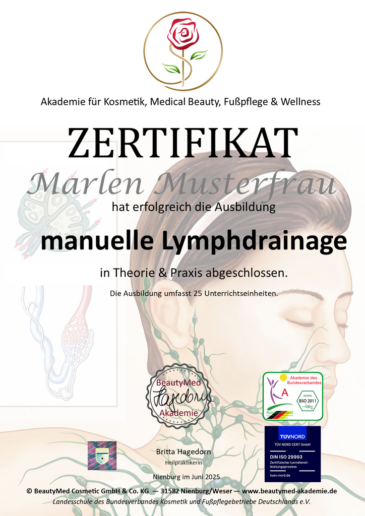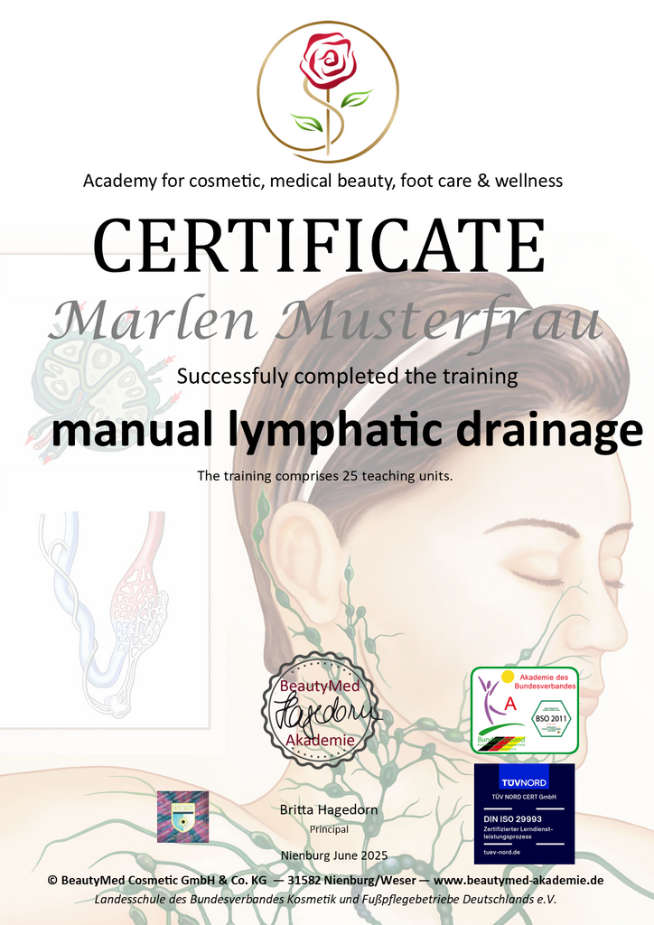 Abschluss: Nach der Ausbildung erhältst Du ein Zertifikat über die erlernte Lymphdrainage. Die Zertifikate erhältst Du von uns automatisch zugeschickt, wenn Du die Online Ausbildung komplett durchgearbeitet hast.